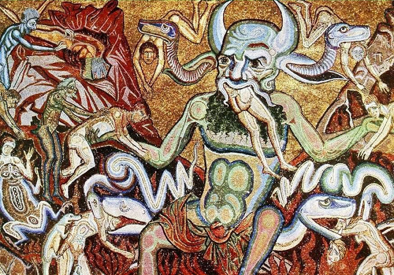 | Diabo mascando precitos. Coppo di Marcovaldo, batistero da catedral de Florença. |